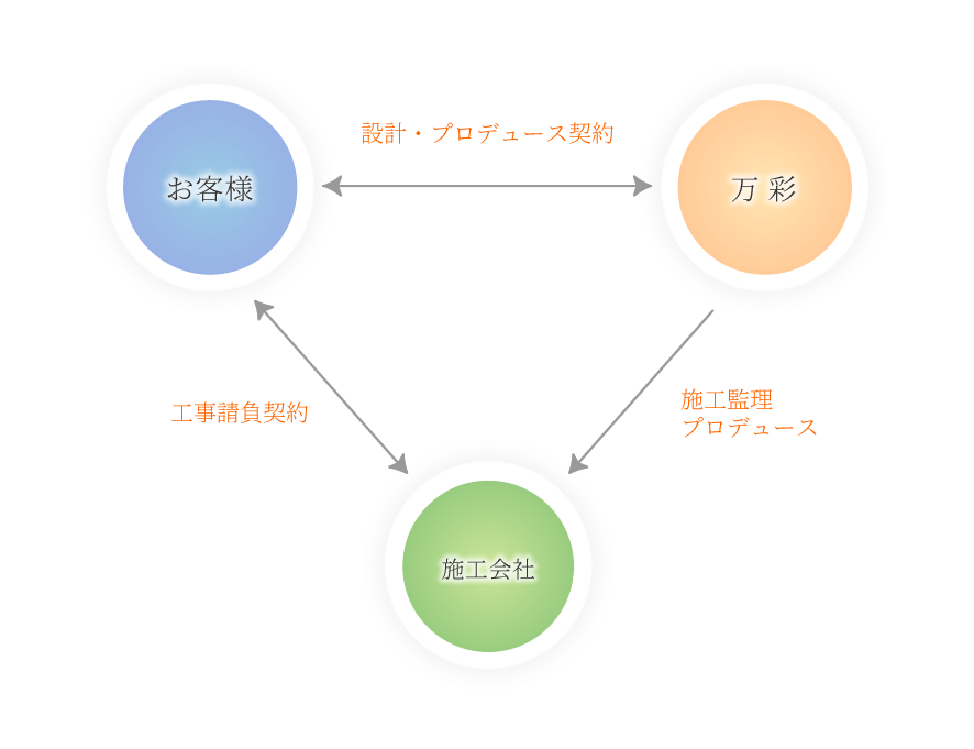 万彩のプロデュースシステムは、「お客様」と「施工会社」を直接結ぶ「分離発注スタイル」。